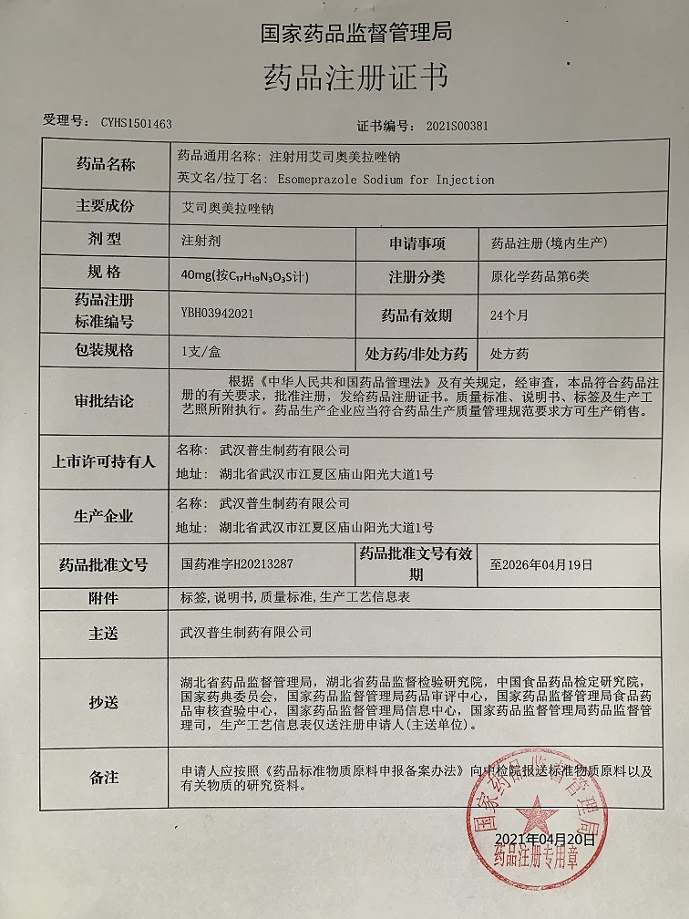 武漢普生制藥有限公司近日收到國家藥品監督管理局核準簽發的注射用艾司奧美拉唑鈉藥品注冊證書,同期關聯申報的艾司奧美拉唑原料藥備案登記狀態更新為A。